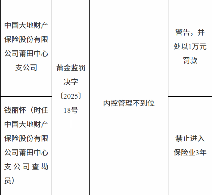 在线配资网官网 大地财险莆田中心支公司因内控管理不到位被罚款1万元,1人被禁止进入保险业3年 中芯 来源:优配合伙人APP下载 网站:展博优配app官网 日期:2025-12-25 15:20:02 查看:89